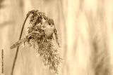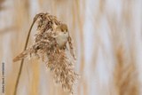 Bearded tit (Panurus biarmicus), female feeding on seeds in reed bed, UK