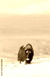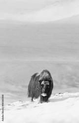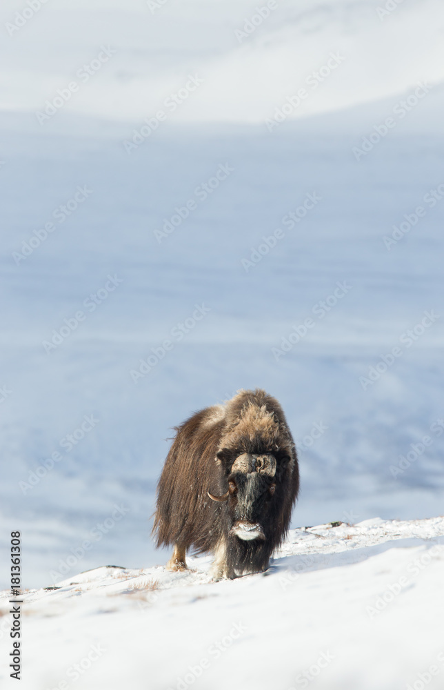 Male musk ox standing in the mountains of Dovrefjell in tough winter conditions in Norway