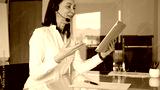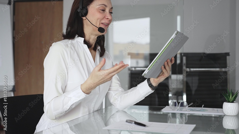 Businesswoman in a white shirt and headset leading a video call from a modern office, presenting with a tablet and gesturing as she discusses strategy and trains remote colleagues