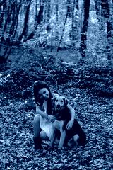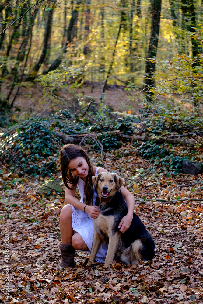 happy little girl with a dog in a beech forest. Autumn season
