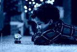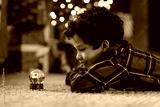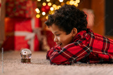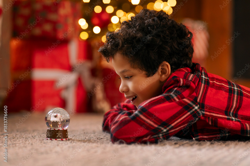 Happy Latin boy in red plaid shirt lying on the floor carpet, captivated by shimmering snow globe, side view