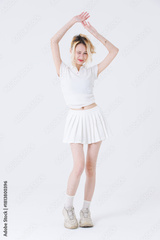 Asian confident attractive beautiful woman blonde hair tied stand wear white shirt top mini skirt sport on background studio portrait fashion street outfit trendy style pose look at camera full length
