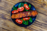 Plate with roasted salmon steak, tomatoes and spinach leaves on a wooden table. Top view
