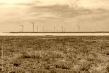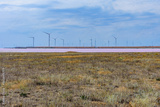 Wind turbines at the shore of lake with pink water. Clean energy. Ecological concept