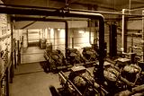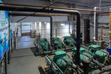 The industrial refrigeration plant room. Multiple green semi-hermetic compressors are connected to a system of copper and insulated pipes, tanks, gauges to provide cooling for a cold storage warehouse