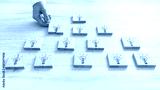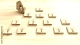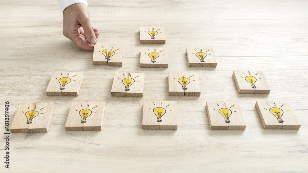 Creative thinking concept with a businessman arranging a series of wooden blocks