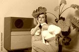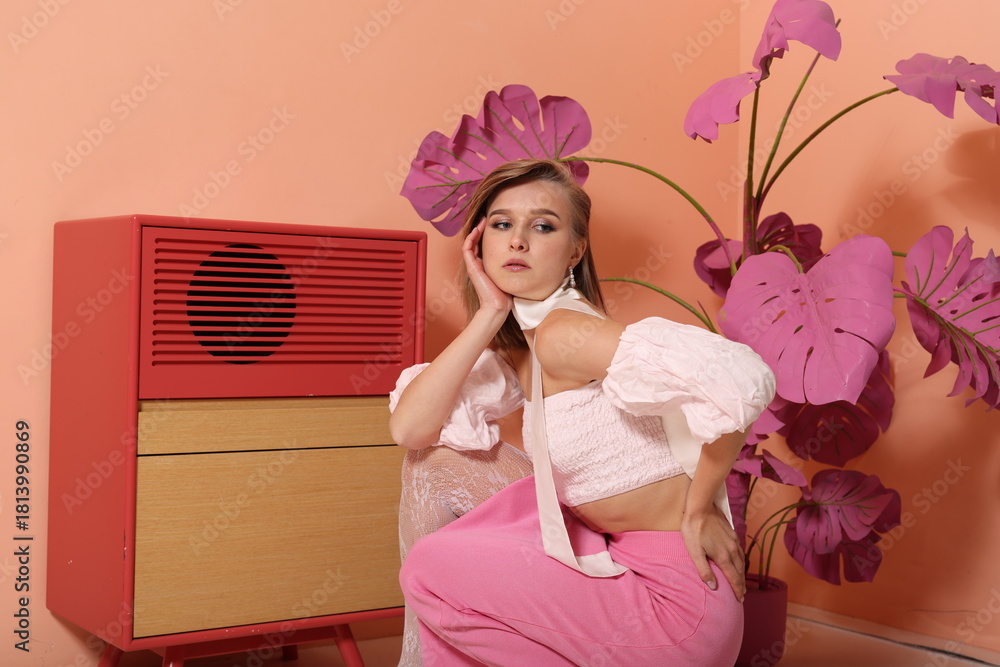 Chic influencer showcasing classic style with pastel illumination