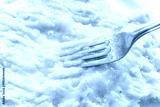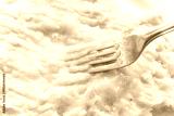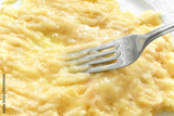 Ripe banana being mashed with a fork on a white plate. Banana puree on a plate. Healthy and dietary food concept.