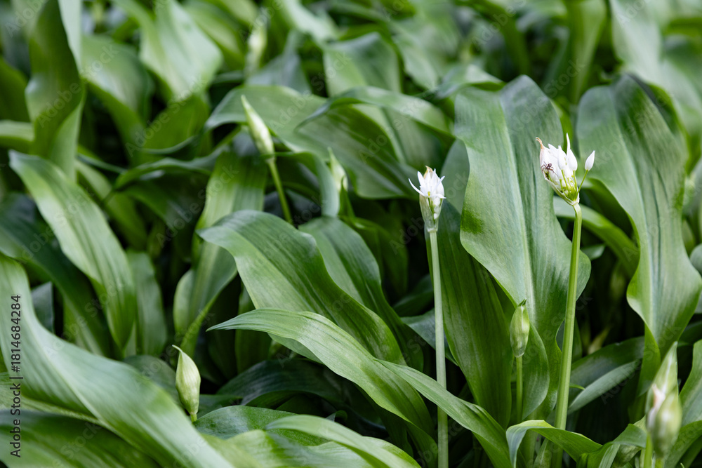 A rich tapestry of vibrant wild garlic, green leaves intermingled with budding flowers showcases the beauty and vitality of nature as it awakens and revitalizes in the springtime sunlight.