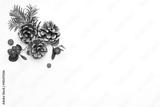 Christmas festive styled stock image floral composition. Pine cones, fir tree branches and red gaultheria berries on white wooden background. Flat lay, top view with empty copy space.