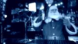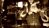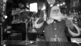Santa Claus works at the bar making cocktails in a shaker.