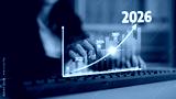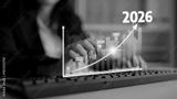 A business professional interacts with a computer while analyzing projected financial growth from 2023 to 2026, visualizing trends for successful decision-making. Tessel