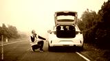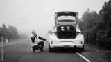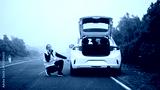 A woman wearing a reflective vest kneels next to a broken down car on a foggy road, demonstrating emergency repair and assistance.