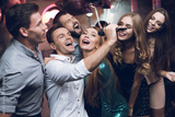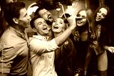 Young people in the club dance and sing. A man in a white shirt is holding a microphone and singing.