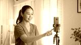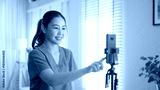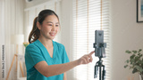 Young adult woman asia Gen Z people anti aging expert modern nurse live talk prepare video selfie camera on mobile phone app mental health care Online side hustle digital virtual asian vlogger filming