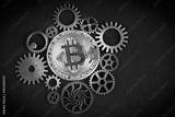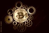 Golden bitcoin glowing among colorful cog wheels on black background with copy space. Cryptocurrency is the future - concept