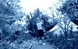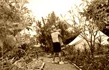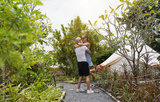 A man and a woman are leisurely walking down a scenic path at the glamping