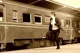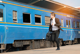 Young asian businessman running to at train station in hand holding a suitcase laptop and wearing formal suit in a rush hour to work. Hurry time.