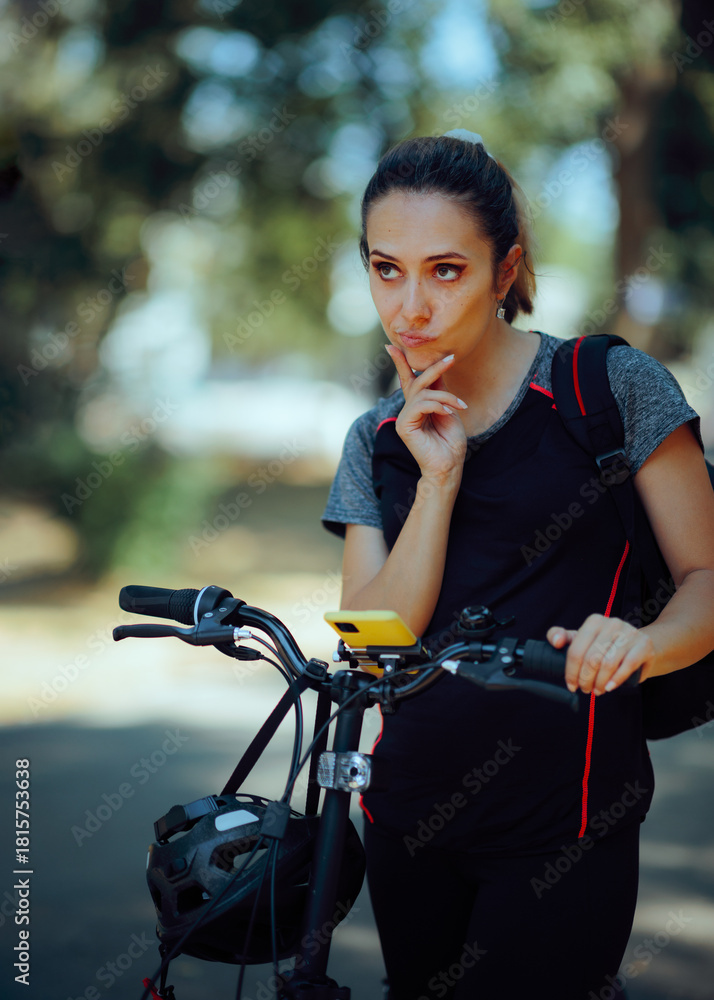 Lost Woman Using a Smartphone to Get Directions for Cycling. Disoriented lady wants to find her way cycling