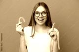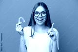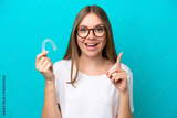 Young Lithuanian woman holding invisible braces isolated on blue background pointing up a great idea