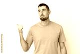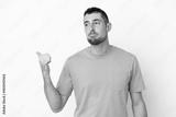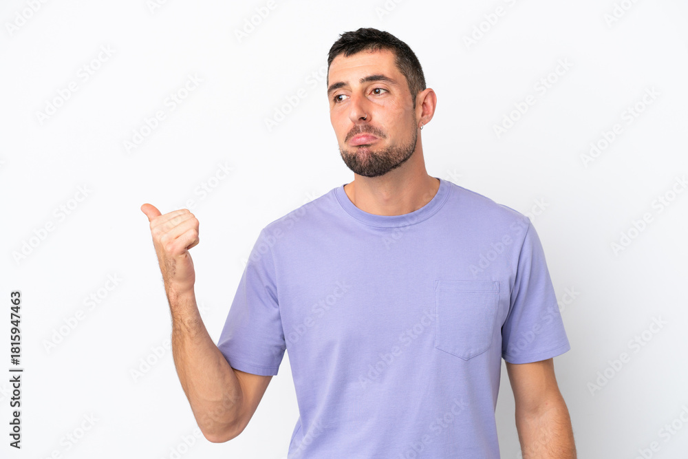 Young handsome caucasian man isolated on white background unhappy and pointing to the side
