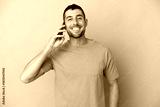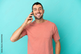 Young handsome caucasian man isolated on blue background keeping a conversation with the mobile phone with someone