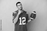 Young caucasian man playing rugby isolated on blue background having doubts while looking up