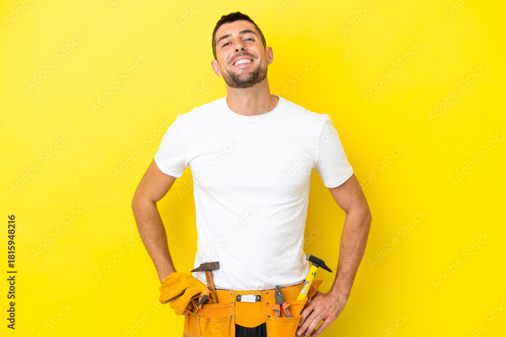 young electrician caucasian man isolated on yellow background posing with arms at hip and smiling