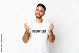 Young caucasian volunteer man isolated on white background making money gesture