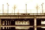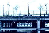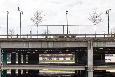 Parking garage under a street with a view through to urban housing, horizontal aspect