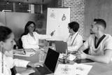African american woman chief physician making presentation in front of male and female international colleagues doctors while team-building, pointing at presentation board, copy space