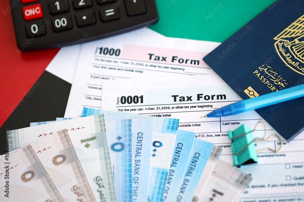 United Arab Emirates dirham money bills and calculator with tax form on flag close up. Taxation and accounting concept