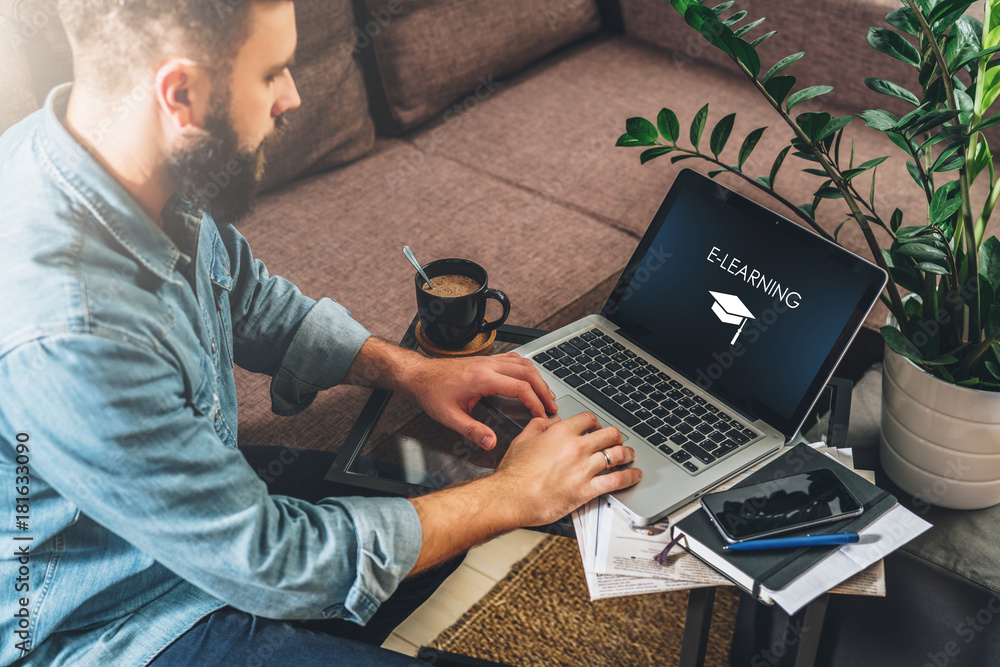 Young bearded hipster man,entrepreneur sits on couch at coffee table,uses laptop with inscription- e-learning on screen.On table notebook,cup of coffee.Online marketing,education,e-learning.Startup.