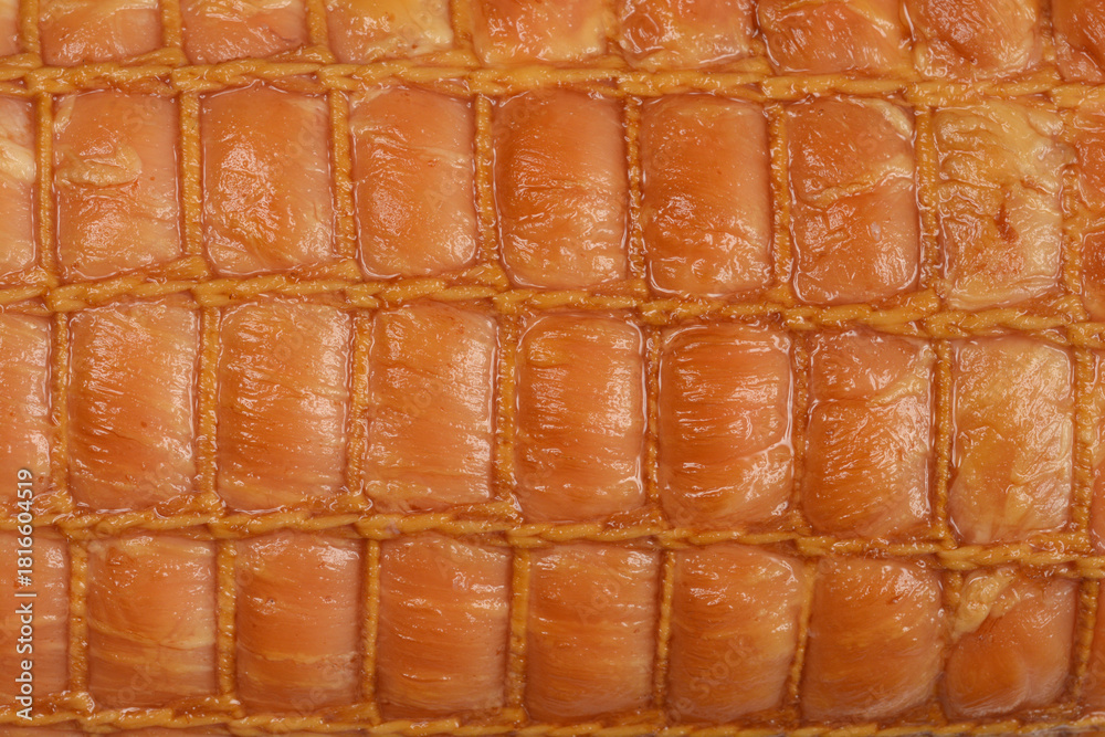 An extreme close-up, full-frame background of the shiny, golden-brown casing of a smoked meat roll, marked by a dense rectangular twine netting pattern