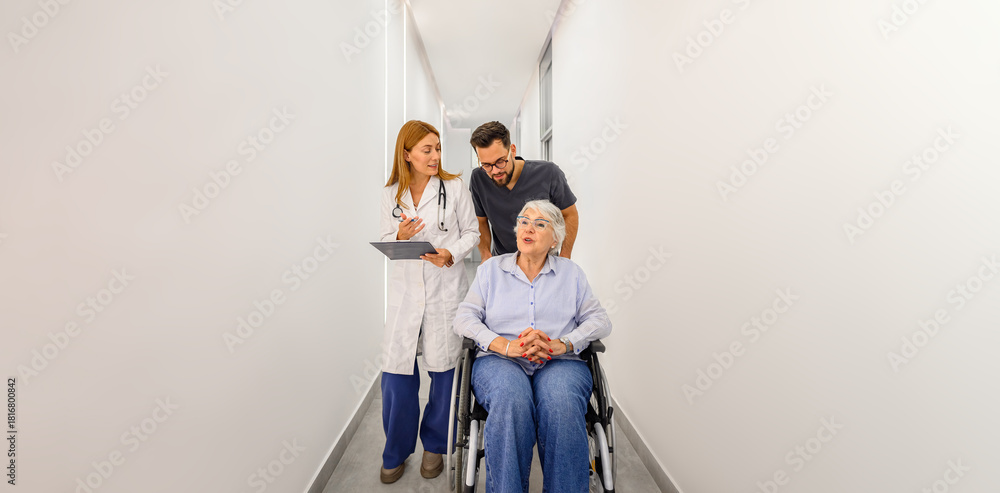 Caring doctors discussing with senior woman on wheelchair about diagnosis and care progress in hospital corridor