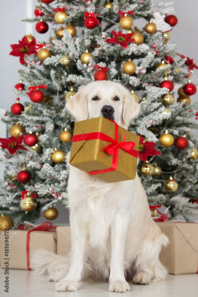 beautiful golden retriever dog sitting in front of a christmas tree holding a gift box in mouth