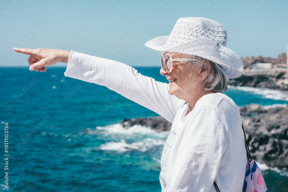 Carefree smiling senior woman in white hat looking at the horizon enjoying a sunny day at the seaside with the blue ocean in the background