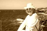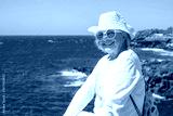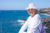 Carefree smiling senior woman in white hat looking at camera enjoying a sunny day at the seaside with the blue ocean in the background