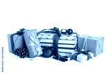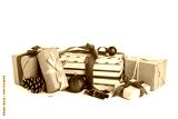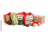 Books with Christmas decor and gifts on white background