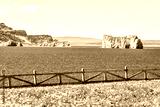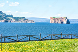 View of Rocher Perce from Bonaventure Island with ocean and gannet birds flying, cityscape skyline or coastline of city, white fence and flowers