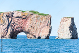 Rocher Perce rock in Gaspe Peninsula, Quebec, Gaspesie region closeup with blue water