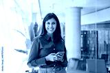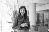 Portrait latin Hispanic young female businesswoman ceo manager working on smartphone, looking at camera. European business woman trader using cell phone mobile app trade online in office. Copy space