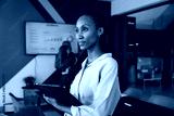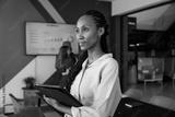 Thoughtful black young businesswoman with tablet in office with colleagues in background