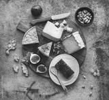 Flat-lay of cheese platter with cheese assortment, figs, honey and nuts over grey concrete background, top view. Party or gathering eating concept