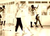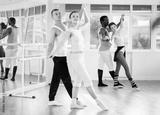 Young man and young woman dancers rehearsing pair ballet in studio