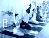 Group of multinational people in sportswear doing upward dog pose on mats in fitness class in morning