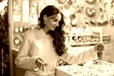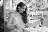 Cheerful young woman looking for New Year decorations in traditional street market in European city