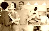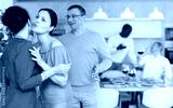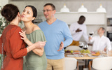Pleased middle-aged man and woman meeting their female friend during get-together at cozy house atmosphere