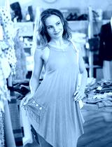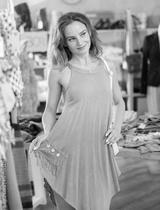 Young brunette tries on a summer blue dress, she carefully watches how it sits and poses in it