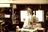 White woman singing out loud while ironing clothes with steaming iron in living room. Happy female adult multitasks during laundry day, performing with joy as boyfriend stands with phone in background
